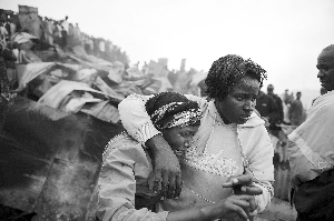 9月12日,肯尼亚首都内罗毕贫民窟的一位女士目睹孩子的遗体后泪流不止,亲属在安慰她。