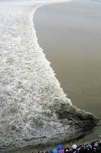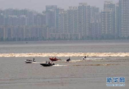 钱江大潮九年来最大 现罕见交叉潮一线潮