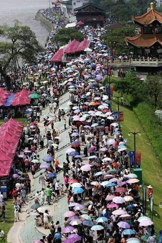 9点半左右 虽说距钱塘江大潮来临还有一个多小时,然而,钱塘江沿岸,特别是海宁沿线早已是人山人海,江边大坝的护栏处也早已围满了里三层、外三层的看潮游客。