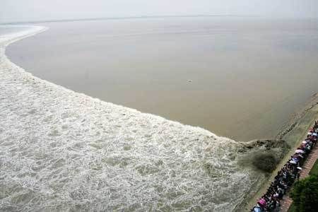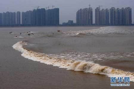 从杭州湾近100公里宽的入海口涌入的潮水,在不到4公里宽的江面上幻化成一条白色“长龙”,以每小时20公里的速度,向上游推进。