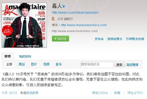 近日,《嘉人》杂志专访了郭美美,并拍摄了一组时尚写真,引发了众多网友的非议,不少人质问“有没有道德底线”。《嘉人》杂志今天凌晨就此事发微博进行了道歉:“我们确有选题不妥当的问题,对此我们将认真内省。我们无意于传播错误的社会价值观,无意于冒犯公众情感,在此向网友和公众诚意致歉。”
