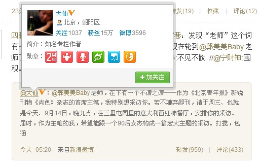 而就在《嘉人》因采访郭美美一事被抛至舆论风口浪尖之时,今天又有人甘冒天下之大不韪,主动向郭美美伸出橄榄枝。自称为《北京青年报》新锐刊物《尚色》杂志首席主笔的新浪微博用户“大仙”在微博中主动邀约郭美美,表示自己希望在今晚9点于三里屯某餐厅对其进行采访。此事也引发了大量网友围观,后续进展临沂网将继续关注。
