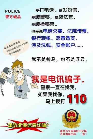 爱打电话,爱发短信,爱装警察,爱装法官,爱装检察官。也爱说电话欠费、法院传票、银行转账、恶意透支、涉及洗钱、安全账户……我不是神马,也不是浮云,我是电讯骗子,警察一直在找我,如果我找你,马上拨打110……这些天,这种“凡客体”的安全防范传单,随着一份份报纸,出现在南京白下区月牙湖派出所辖区的居民家中,同时还贴上了“南京市局白下分局”的官方微博。粉丝们大呼“给力”,一名居民还靠这个识破了骗子的伎俩。