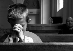 2010年5月8日,海牙,一名儿童在教堂里祈祷,一名神父在后面看着他。摄影师用这样的场景,隐喻天主教会性侵儿童案件。