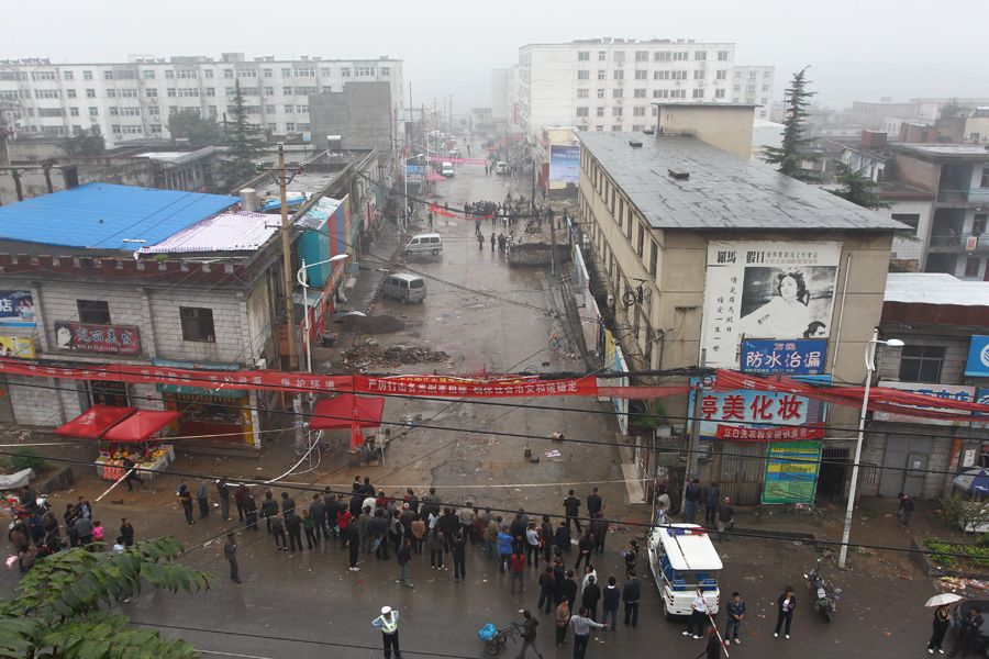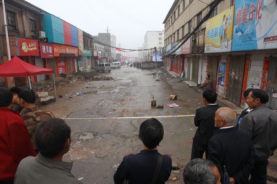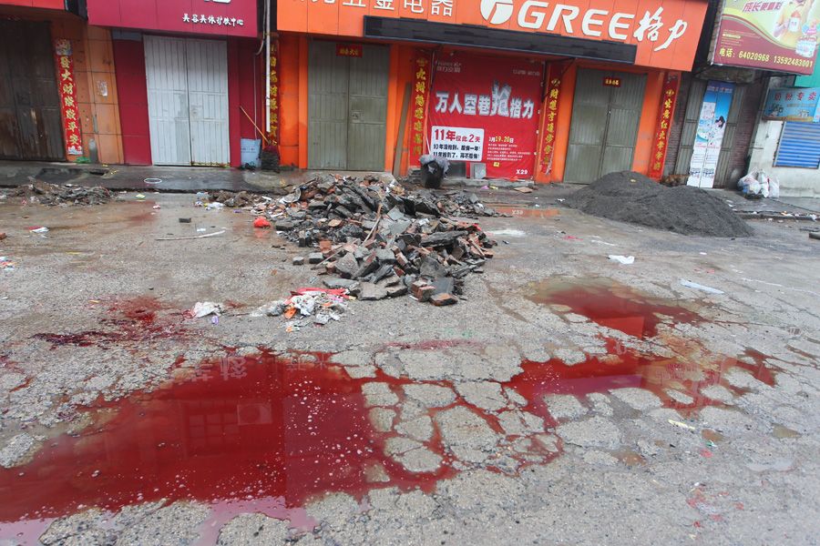 据巩义市外宣办通报,9月14日上午8时30分左右,巩义市涉村镇东安村村民王宏斌于该镇区东大街持斧行凶伤人,当场造成4人死亡、2人重伤。2名伤者被送往医院抢救,经抢救无效死亡。图为事故现场。