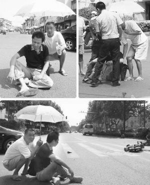 9月15日中午12左右,烈日当空,扬州市民朱先生骑着电动车在大学南路的机动车道上由南往北行驶,去扬大医学院办事。当他行至与荷花池南路一个小交叉口处,一辆由东向西行驶的轿车向南左转弯,因避让不及,两车相撞,朱先生被撞倒在地,电动车摔出数米远。
