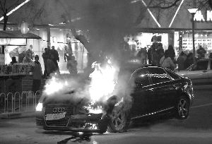 去年12月17日晚,被王烁倒车撞坏的王珂军牌奥迪在马路上起火燃烧。