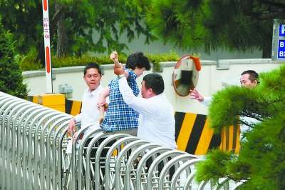 18日,在韩国仁川市,安保人员阻拦一名正在与ACE储蓄银行工作人员发生争执的储户(中)。韩国金融服务委员会18日决定,勒令7家经营不善的储蓄银行自当日午间起暂停营业半年。新华/路透