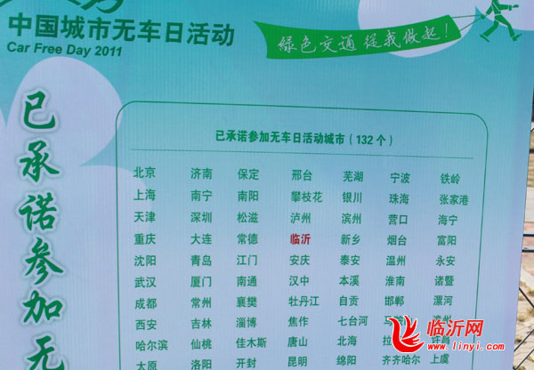 2011年中国城市无车日活动,全国共132个城市承诺参加,山东省有济南、青岛、烟台、临沂四个城市参加,其中临沂作为红色革命老区参加中国城市无车日,反应了老区人民的生活质量不断提高,从社会的各个方面建设大美临沂、绿色临沂。