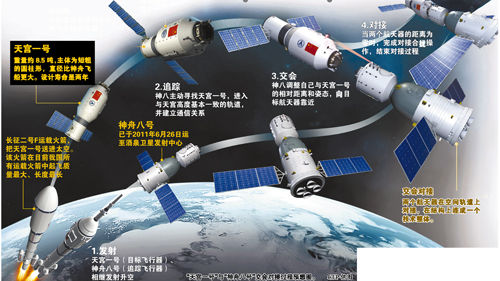 “天宫一号”发射后,我国将再发射无人飞船“神舟八号”,与“天宫一号”进行无人自动对接试验。2015年前,再陆续发射“天宫二号”、“天宫三号”两个空间实验室。此次发射“天宫一号”,其核心任务就是试验空间交会对接。