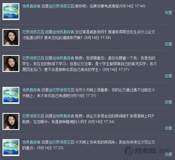 “教授潜规则女研究生”微博对话截图