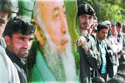 9月21日,阿富汗首都喀布尔,人们抬着遇害的阿富汗前总统拉巴尼的画像参加悼念集会。阿富汗高级和平委员会主席、前总统布尔汉丁·拉巴尼20日晚在其家中遭自杀式炸弹袭击身亡。