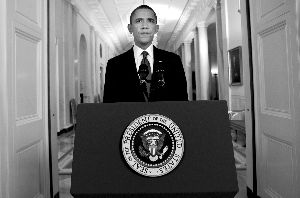 美国东部时间1日夜里11时35分(北京时间2日上午11时35分),奥巴马在白宫东厅发表声明。