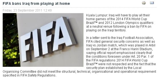 在国际足联给伊拉克足协的书面函件中称,“根据国际足联巴西世界杯预选赛竞赛章程第20章第1款,在9月2日进行的伊拉克和约旦比赛中,相关国际足联规定并没有得到尊重和实施,同时场馆的安保条件并不符合标准。”国际足联称,不仅是在伊拉克本土主办的世预赛,而且还包括奥预赛12强赛,都不得在伊拉克本土进行,必须要另外选择其他中立国场地。