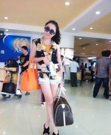 右手挎一个橘红色爱马仕包,左手提一个LV大旅行包。最近这张照片在网上疯传