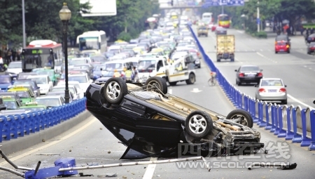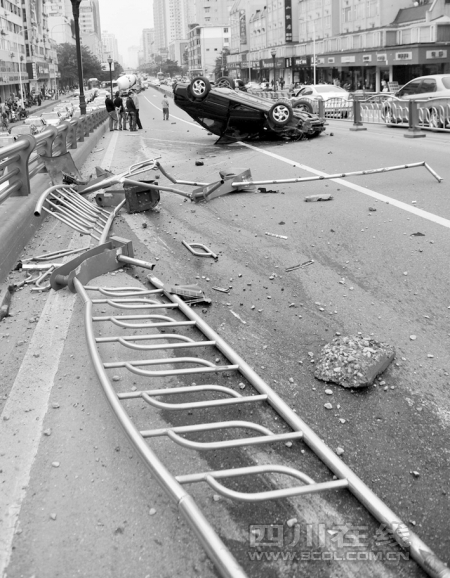 “(黑色轿车)先是侧撞在护栏上行驶,撞坏10多米长的护栏后冲到了桥上另一边的车道上。”徐廷富说,轿车开到对面车道后并没有减速,而是一头撞上了桥沿,并高高弹起,翻倒在桥面上。