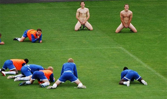昨天,挪威乙级联赛球队Sandefjord的官方网站出现一张有意思的照片。照片中,该队的两位门将安顿森和贝尔滕森赤身裸体出现在训练场上。据悉,这两名球员是该俱乐部青年队的门将,他们在与一线队两位大哥门将埃文和伯恩斯的网式足球比赛中败北。作为惩罚,他们必须全裸参加训练。