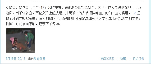 9月19日20点18分,博友@鹰瞰世界更新了一条微博:《最美最善良女孩》 17:30左右,在南湖公园摄影创作,突见一位大爷跌倒在地,脸抢地面,出了许多血。两位女孩上前扶起,并用纸巾给大爷擦拭鲜血,她们一直守候着,120急救车赶到才默默离去。在我的追问下,得知她们分别是沈阳药科大学和沈阳建筑大学的学生。我被当时的场面感动,记录下了现场。