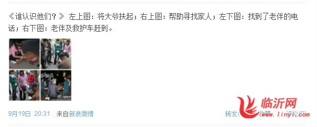 @鹰瞰世界 :左下图:将大爷扶起;右上图:帮助寻找家人;左下图:找到了老伴的电话;右下图:老伴及救护车赶到。