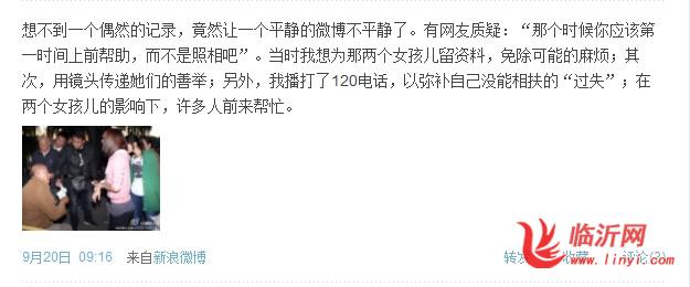 @鹰瞰世界:想不到一个偶然的记录,竟然让一个平静的微博不平静了。有网友质疑:“那个时候你应该第一时间上前帮助,而不是拍照吧”。当时我想为那两个女儿留资料,免除可呢过的麻烦;其次,用镜头传递她们的善举;另外,我拨打了120电话,以弥补自己没能相扶的“过失”;在两个女孩儿的影响下,许多人前来帮忙。