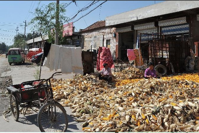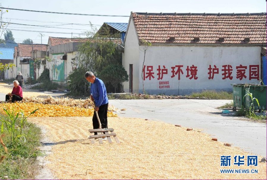 9月22日,取缔废旧塑料市场后的白云湖镇石东村村民在晾晒收获的玉米。新华社记者 徐速绘 摄