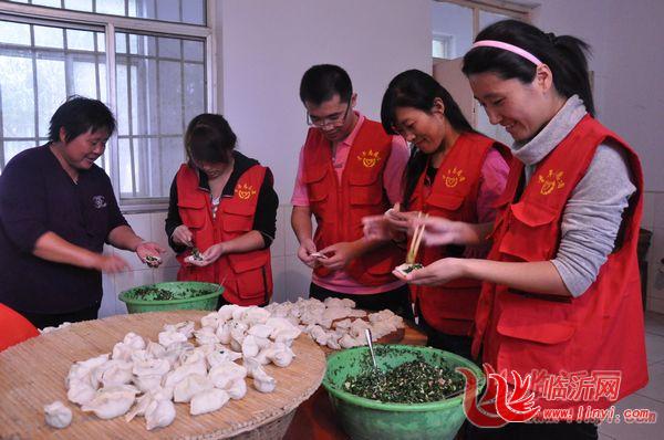 图7志愿者与敬老院工作人员一起为老人包饺子。