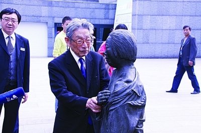 听说1日南京大屠杀幸存者倪翠萍老人去世了,久保惠三郎执意要看看倪翠萍的铜像。在铜像前,老人的眼睛渐渐红了,他握住铜像的手臂,一个劲地说“对不起,希望你在天堂一路走好”。喃喃自语中,老人又对着倪翠萍的铜像连鞠了三个躬。