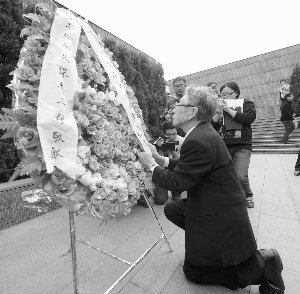 久保先生向南京大屠杀遇难者敬献花圈,诚恳谢罪。