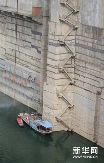 这是水位明显下降的丹江口水库大坝(4月30日摄)。受持续干旱天气影响,南水北调中线工程水源地湖北丹江口水库近日出现罕见低水位。5月5日8时,水库水位为135.11米,比139米死水位线低近4米。目前,相关人员正对库区控制断面和饮用水源地加强监测工作。新华社发