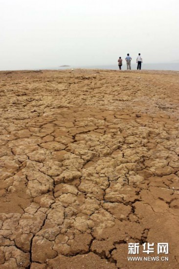 这是丹江口水库内因为干旱裸露出来的河床(5月1日摄)。受持续干旱天气影响,南水北调中线工程水源地湖北丹江口水库近日出现罕见低水位。5月5日8时,水库水位为135.11米,比139米死水位线低近4米。目前,相关人员正对库区控制断面和饮用水源地加强监测工作。新华社发