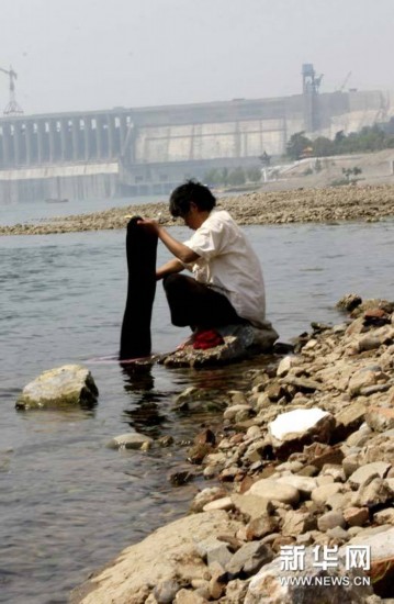 5月5日,一名男子在湖北丹江口水库下游裸露的河床边洗衣服。受持续干旱天气影响,南水北调中线工程水源地湖北丹江口水库近日出现罕见低水位。5月5日8时,水库水位为135.11米,比139米死水位线低近4米。目前,相关人员正对库区控制断面和饮用水源地加强监测工作。新华社发