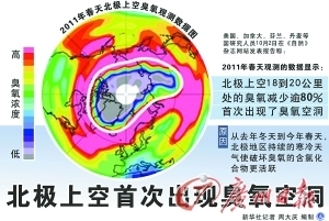 研究人员说,去年冬天至今年春天,北极地区15公里至23公里的高空臭氧严重减少,最大幅度减少发生在18公里至20公里的位置,减少幅度超过80%。
