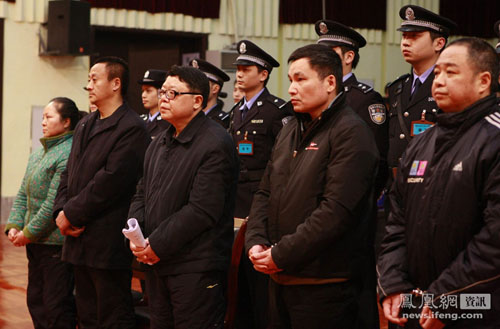 2月2日文强(前排左三)及妻子周晓亚出庭受审