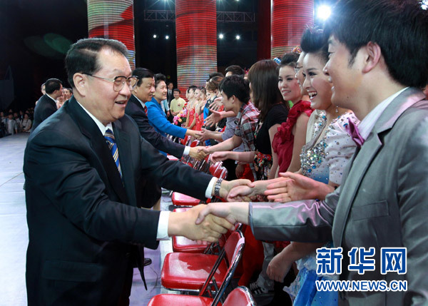 5月4日,全国大学生校园文艺会演《五月的鲜花——永远跟党走》在北京举行。中共中央政治局常委李长春观看演出。这是演出结束后,李长春与大学生们亲切握手。新华社记者庞兴雷摄