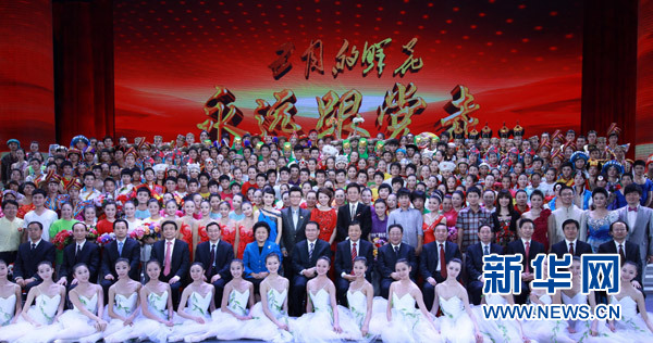 5月4日,全国大学生校园文艺会演《五月的鲜花——永远跟党走》在北京举行。中共中央政治局常委李长春观看演出。这是演出结束后,李长春与大学生合影。新华社记者庞兴雷摄