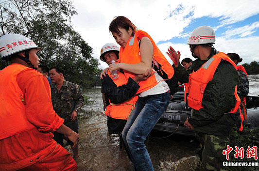 45名来自海南越野e族俱乐部的“穿越发烧友”,被困海南白沙县老黎办大山约40小时后,经白沙县政府和消防官兵近20个小时的营救,5日上午10时许,首批12名“穿越发烧友”被营救出山,截至中午12时被困45人全部步行走出被困山路,无人伤亡或疾病。14辆被困车辆仍留在山道上。图为被困游客中年龄最小的游客安全获救。