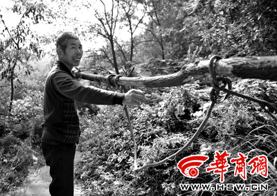 两老人抬着小伙子下山