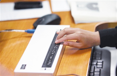 一名工作人员在用盲人专用键盘校对。