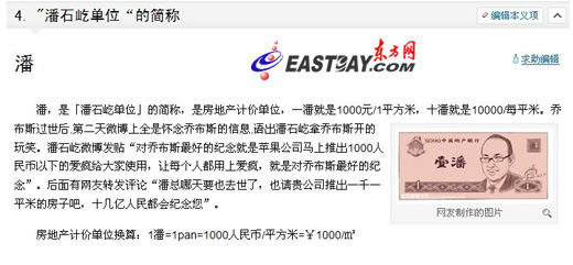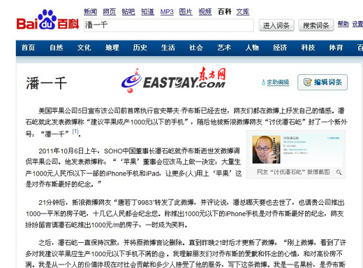 SOHO中国董事长潘石屹就乔布斯逝世发微博调侃苹果公司,网友纷纷留言请潘石屹推出1000元/平方米的房子,“潘一千”一时成为笑料。近日,有网友发现,就连百度都将“潘一千”收入百度百科,成为专有名词。