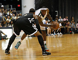 詹姆斯今天继续演练自己今夏苦练的低位单打技术,面对韦德的贴身防守,他利用身体挤到篮下投篮,却遭遇韦德封盖,还好威斯布鲁克抢到前场篮板,二次进攻得手。詹姆斯队将比分迫近至15比16。