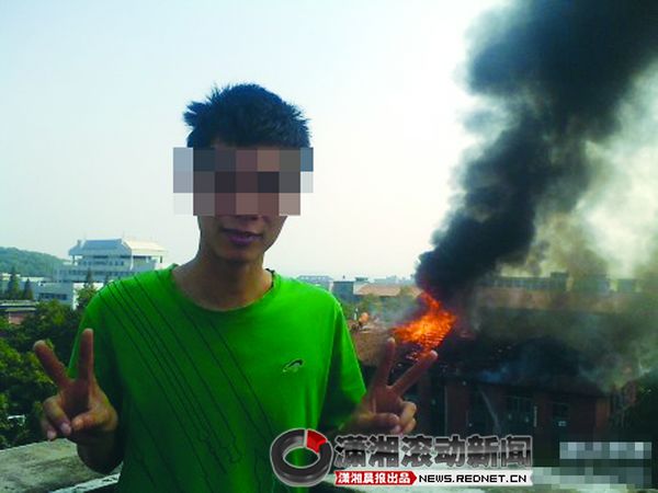 腾讯微博上一位网友在大楼起火之后用手机拍了几张现场照片发微博,其中一张照片引发网友的批评。在这张照片上,身穿绿色汗衫的他两手摆出“V”字,背后是顶楼正在燃烧的理学楼。在发照片的同时,他在微博上写道,“我以中南大学本部大火为背景,秀1个让大家看看。六哥敬上。”此微博发布后引来网友批评如潮。