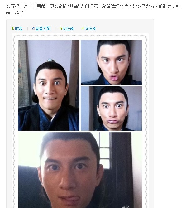 卖萌日不能光看不拍。于是不少人都借着卖萌日的东风开始在微博上晒起了自己的搞怪萌照。最近大热的穿越剧《步步惊心》中的四爷吴奇隆也没有闲着,在自己的微博上发了一组在片场搞怪的照片,“为庆祝十月十日卖萌日,更为齐国熊猫族人们打气,希望这组照片能给你们带来笑的动力。哈哈,拼了!”照片中吴奇隆眼睛睁大,眼珠突起,确实很像熊猫;还配合以各色嘴部动作,露出一排上牙,咬住嘴唇;嘴巴撅起;还有一张把舌头伸出,十分搞怪。大叔的年龄正太的心,挤眉弄眼的神态引发了无数网友的围观。截至记者发稿时,吴奇隆的这条卖萌微博已经被转发了近万次。“四爷,你是萌主啦!”网友评论。