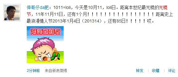 下月十一日的光棍节也提前被网友提上了日程,“觉得自己在11年11月11日光棍节还单身的请举手”。热衷过节,网友的兴致很高啊。(杨甜子)
