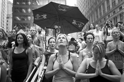 10日,纽约,“占领华尔街”活动的示威者参加公共瑜伽课程,响应抗议活动。
