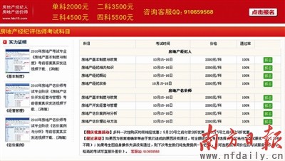 “2000元/科、3500元/二科、4500元/三科、5500元/四科”。在该网站上,此房地产两项考试考题与答案价格明码标价(如上图)。同时早在一两个月之前该网站就开始了试题出售的营销大战,并推出优惠活动。“9月20号之前付款八折优惠,10月5号之前付款九折优惠”。