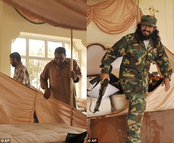 据报道,利比亚当局的武装人员已经占领了卡扎菲在苏尔特的豪华行宫,两名武装人员在卡扎菲金黄色的高档卧室中休息。从床上挂的帷幔和精致的壁灯可一窥卡扎菲宫殿的奢华景象。