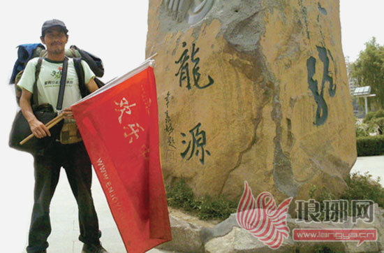 “徒步万里走西部,冲刺黄河源头”是费玉玺徒步的主题。上一次与记者交流是在2008年,QQ名称是“千里走单骑”。2011年10月4日,费玉玺现身沂河边,急行军式的背包、密密匝匝写满人名的小红旗和有些斑白的胡须,“行者,就是走在路上,看我这身装扮,懂的旅行的人就应该知道我是资深驴友。”费玉玺说。
