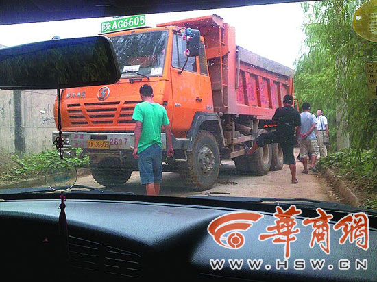 2011年7月华商报记者在某“建筑垃圾场”采访时,被多辆渣土车围堵40分钟