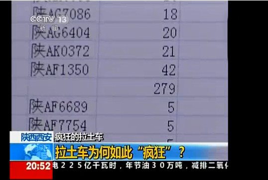 10月9日,央视新闻频道东方时空栏目聚焦西安渣土车问题,报道中一组数字令人惊讶,仅7月份,交管部门通过GPS确定的西安渣土车闯红灯、超速等违章行为就达到了12000多次,其中一辆车号为“陕AF1350”的渣土车违章数量竟达到42次之多。今日在微博和网络论坛上,西安网友发布“通缉令”,号召对号牌为陕AF1350的渣土车进行全城“通缉”。