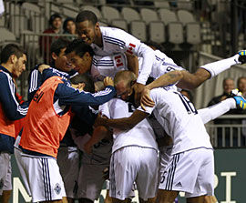 比赛开始仅1分钟温哥华白帽队就进球了。哈尔维右路传中,桑维佐在禁区中间位置起右脚射门,皮球飞入球门右上角,主场作战的白帽队1比0领先。